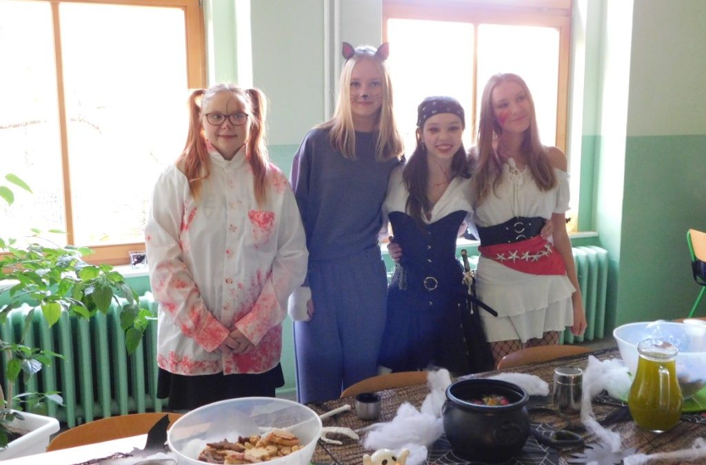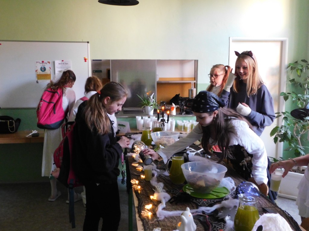 A co teprve večer! Proběhla halloweenská stezka odvahy, kterou pro žáky I. stupně připravili deváťáci, a ti proměnili školu v jednu obrovskou strašidelnou laboratoř, kde by se bál i Frankenstein.