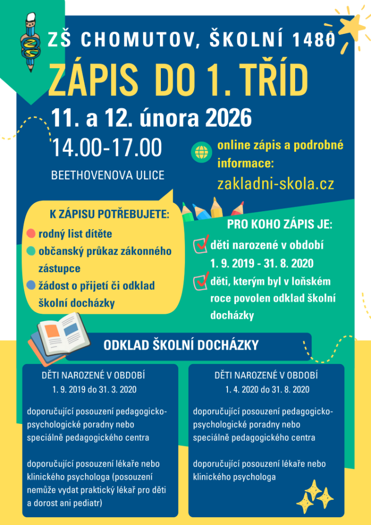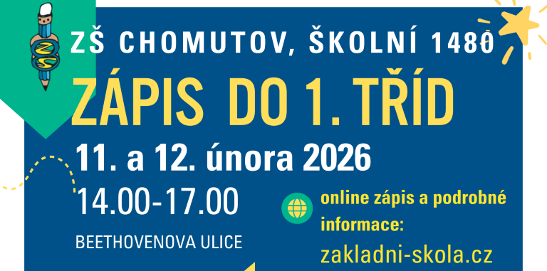 Zápis do prvních tříd proběhne dne 11. února 2026 od 14 do 17 hodin a dne 12. února 2026 od 14 do 17 hodin v budově prvního stupně v Beethovenově ulici.